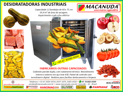 www.macanudavencetudo.com; www.picardiavencetudo.com / Desidratadoras (Estufas, Secadoras) de frutas, peixes, hortaliças, pólen, ervas, chips de coco, queijos,... Gabinete parede dupla, com isolamento térmico em lã de rocha. * Revestimento interno e externo em chapa de aço inox AISI 430. * Termômetro digital. * Turbo para ventilação horizontal entre as bandejas. * Bandejas em aço inox 430, alumínio (chapa expandida) ou tela de nylon ou aço inox. Diversos modelos e capacidades. Aquecimento elétrico, misto (elétrico e gás) ou somente a gás.